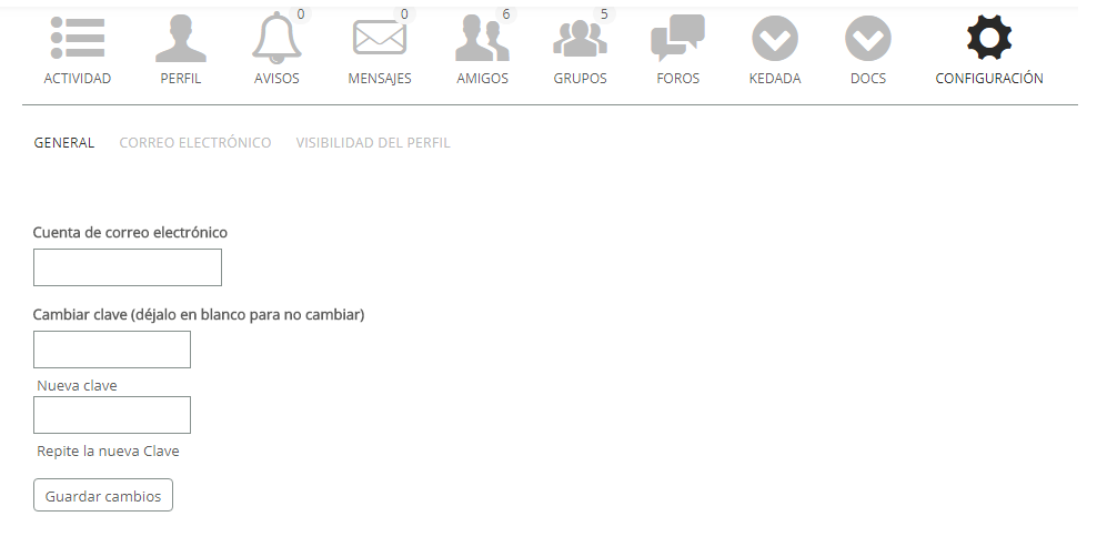 - Te aparecerá la siguiente página con la opción de cambiar tu contraseña. Introduce tu correo electrónico, escribe tu nueva clave dos veces y haz click en Guardar cambios.