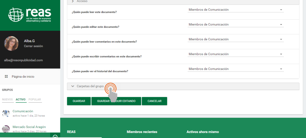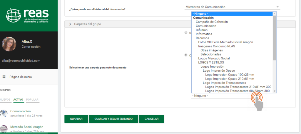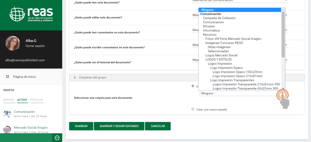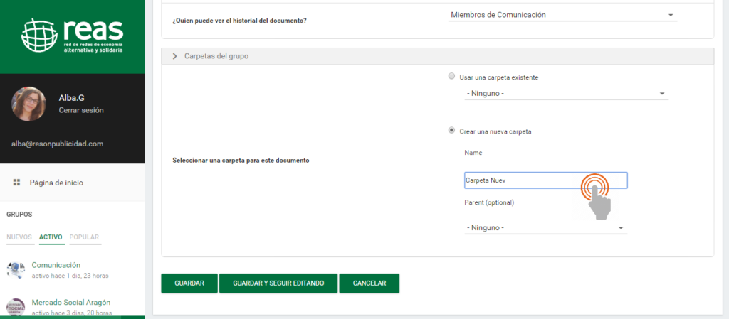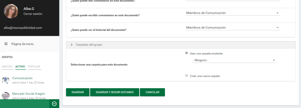 6- A continuación, continuando con las funciones para organizar los documentos, nos encontraremos la opción «Carpetas del grupo». Es importante señalar que esta opción únicamente aparecerá si previamente hemos seleccionado un «Grupo Asociado» (como hemos explicado en el paso nº 4 de este tutorial).