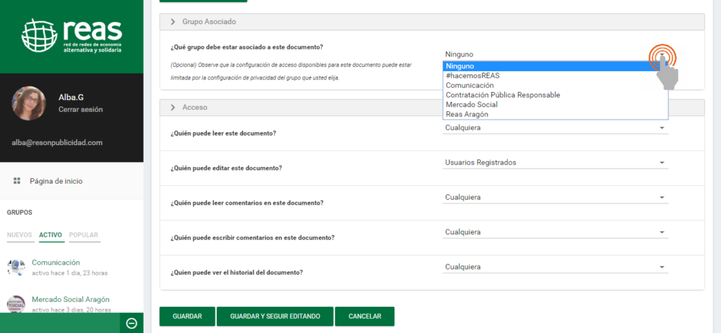 4- A continuación, nos aparecen las siguientes opciones: «Grupo Asociado» y «Acceso». Es importante que para poder organizar posteriormente el grupo en carpetas escojamos un grupo asociado para nuestro documento, es decir, que elijamos dentro de qué grupo de trabajo se va a encontrar el documento: